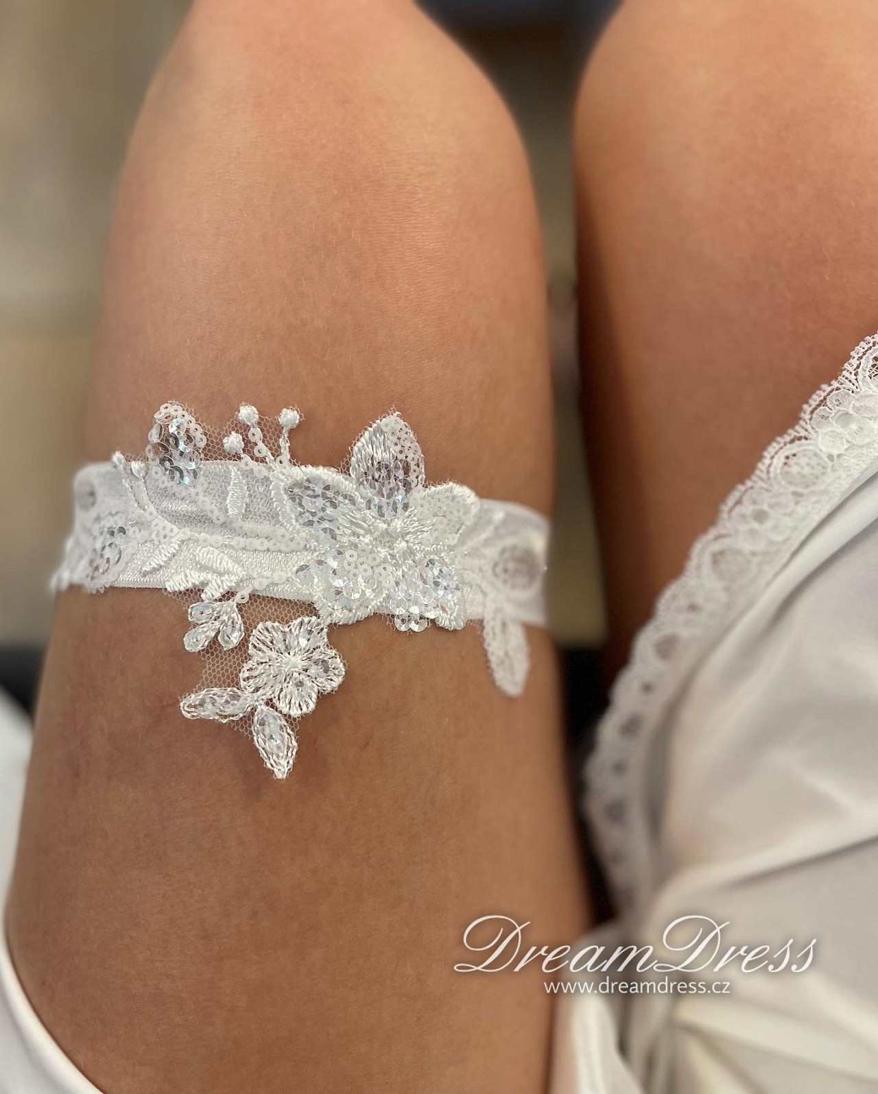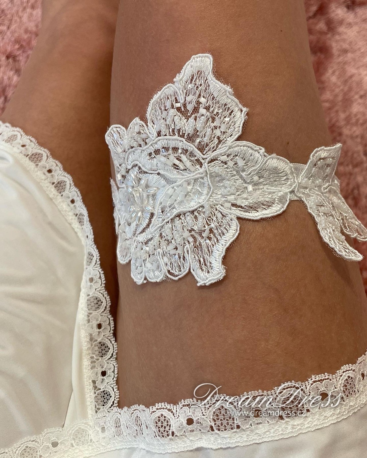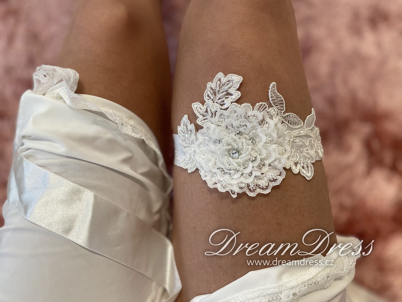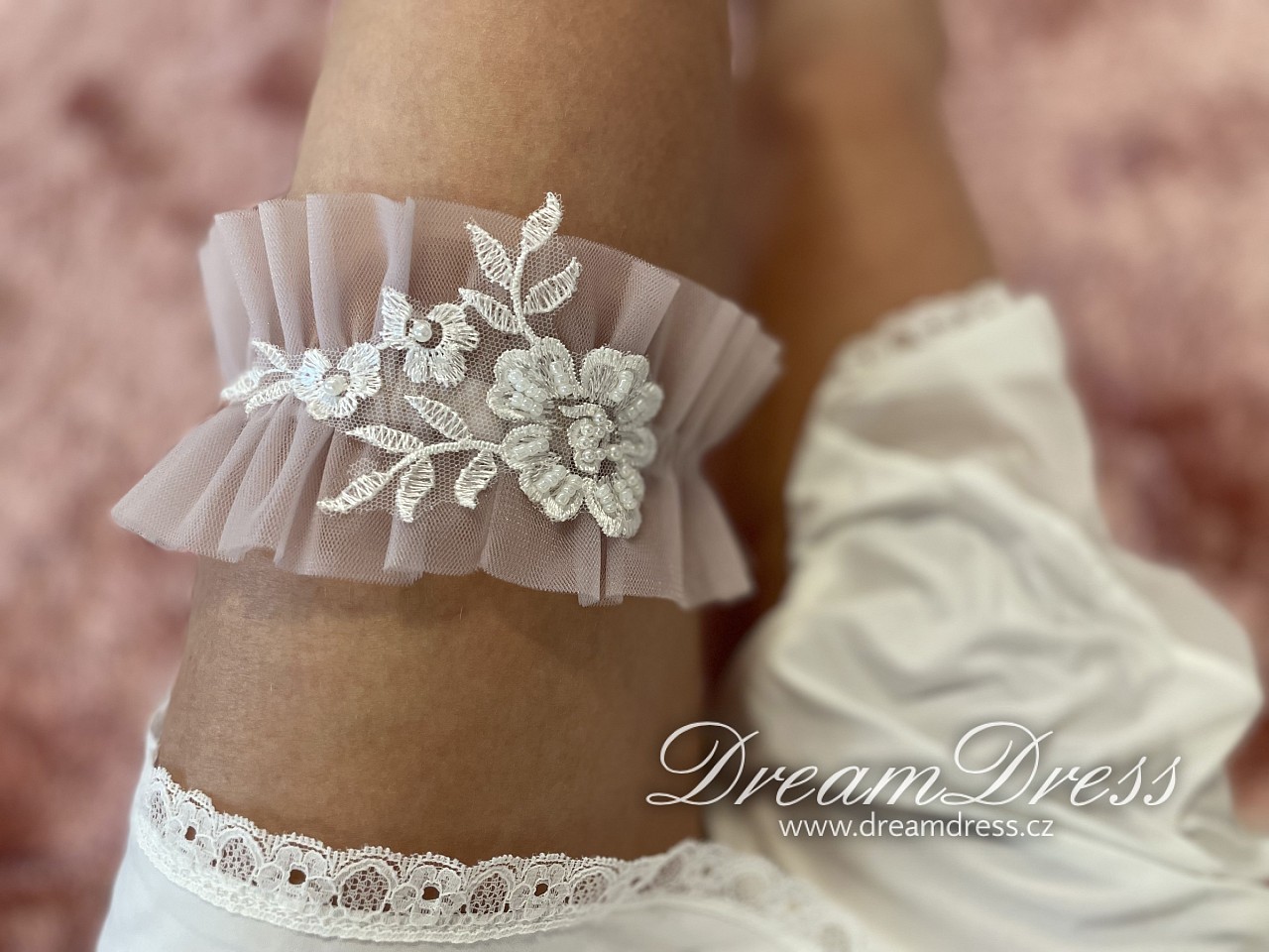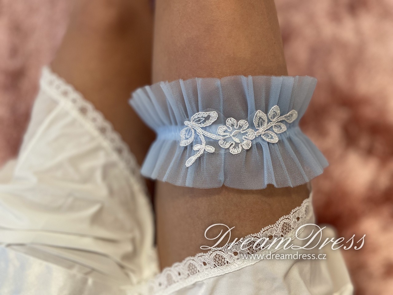 Naše nevěsty dostávají podvazek jako dárek k zapůjčeným šatům.